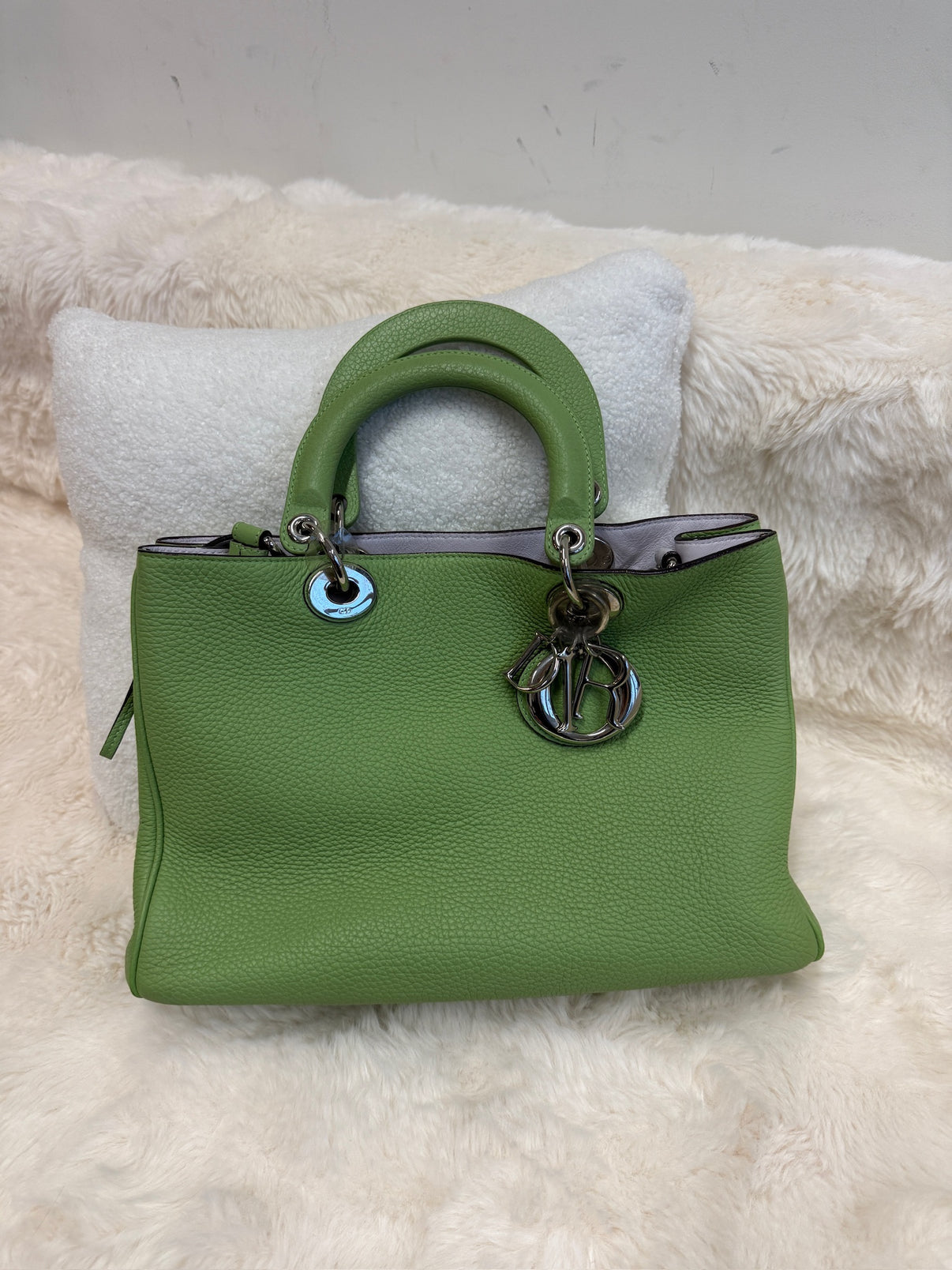 Christian Dior top handle bag in green leather with a structured silhouette.