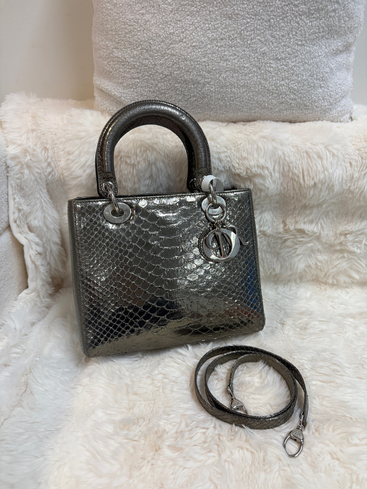 A striking and rare Lady Dior handbag crafted from luxurious python leather in a sophisticated metallic grey finish. This iconic silhouette is elevated by the exotic texture and subtle shine, making it a true collector’s piece and a statement accessory for any luxury wardrobe.