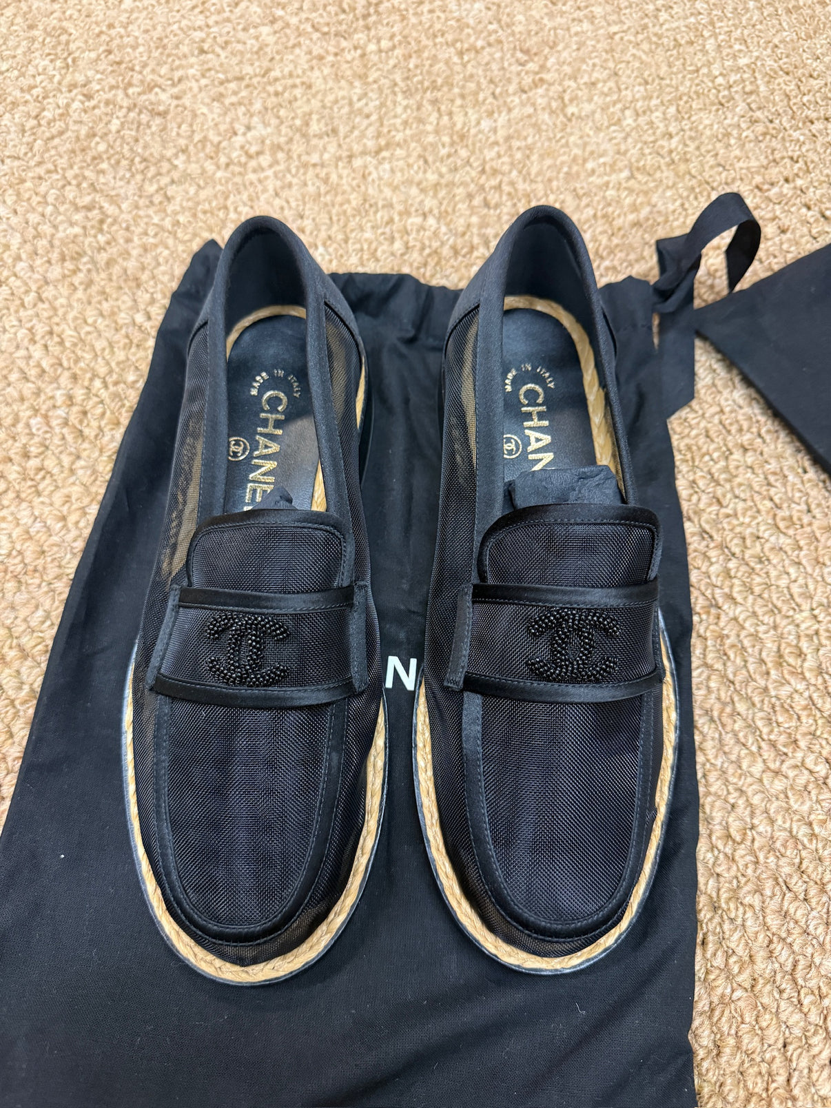 Brand new Chanel loafers crafted in black mesh with tonal leather trim.