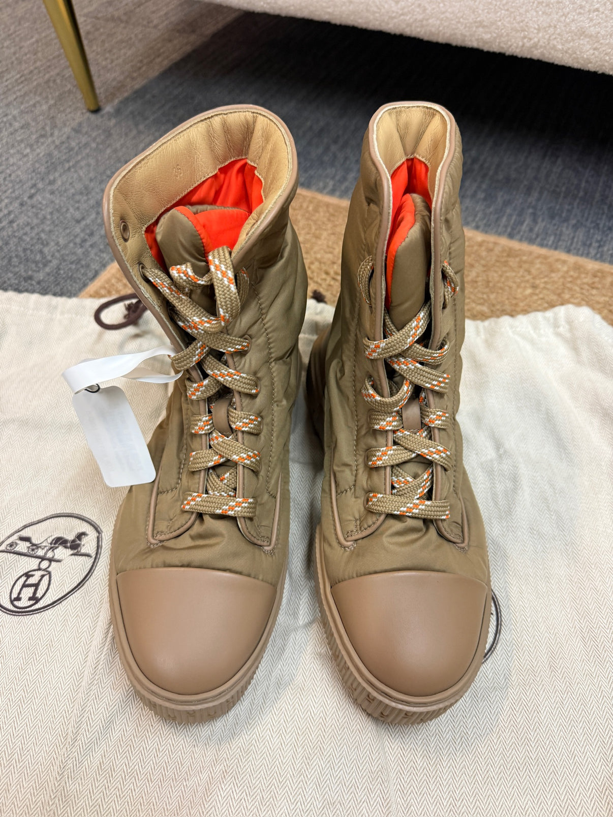 These Hermès lace-up ankle boots combine utilitarian design with the refined craftsmanship the house is known for. Crafted with a lightweight nylon upper and smooth leather trim, they offer both durability and comfort, while the bold contrast lining adds a subtle statement detail.