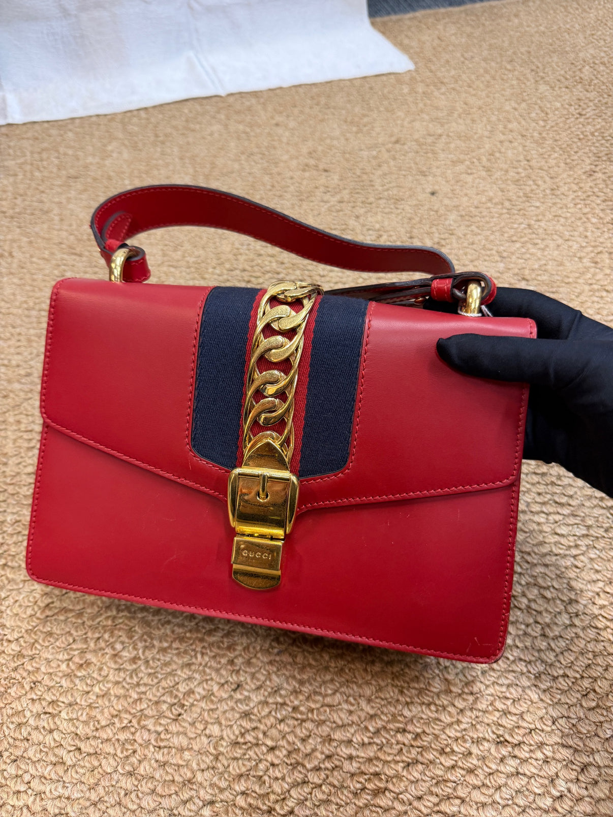 This Gucci shoulder bag is crafted in smooth red leather and features a structured flap silhouette accented with a signature fabric stripe panel. A bold gold-tone chain detail runs down the front and connects to a metal clasp engraved with the Gucci logo, adding a distinctive vintage-inspired touch. Finished with a top handle and a shoulder strap, this piece combines statement design with everyday functionality.