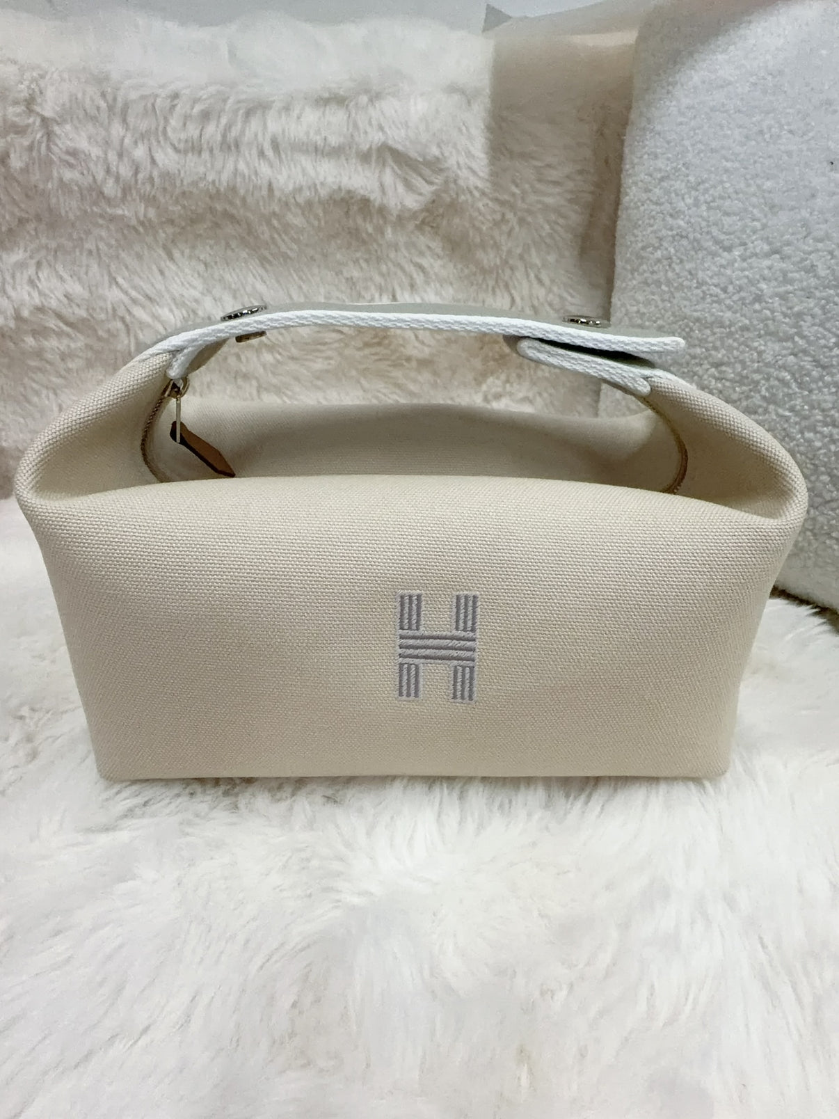 A minimalist Hermès cotton pouch in a clean neutral tone, featuring the iconic embroidered “H” detail on the front. Made in France from 100% cotton, this piece is lightweight yet practical—perfect for organizing daily essentials or using as an inner bag. A timeless Hermès accessory suitable for everyday use