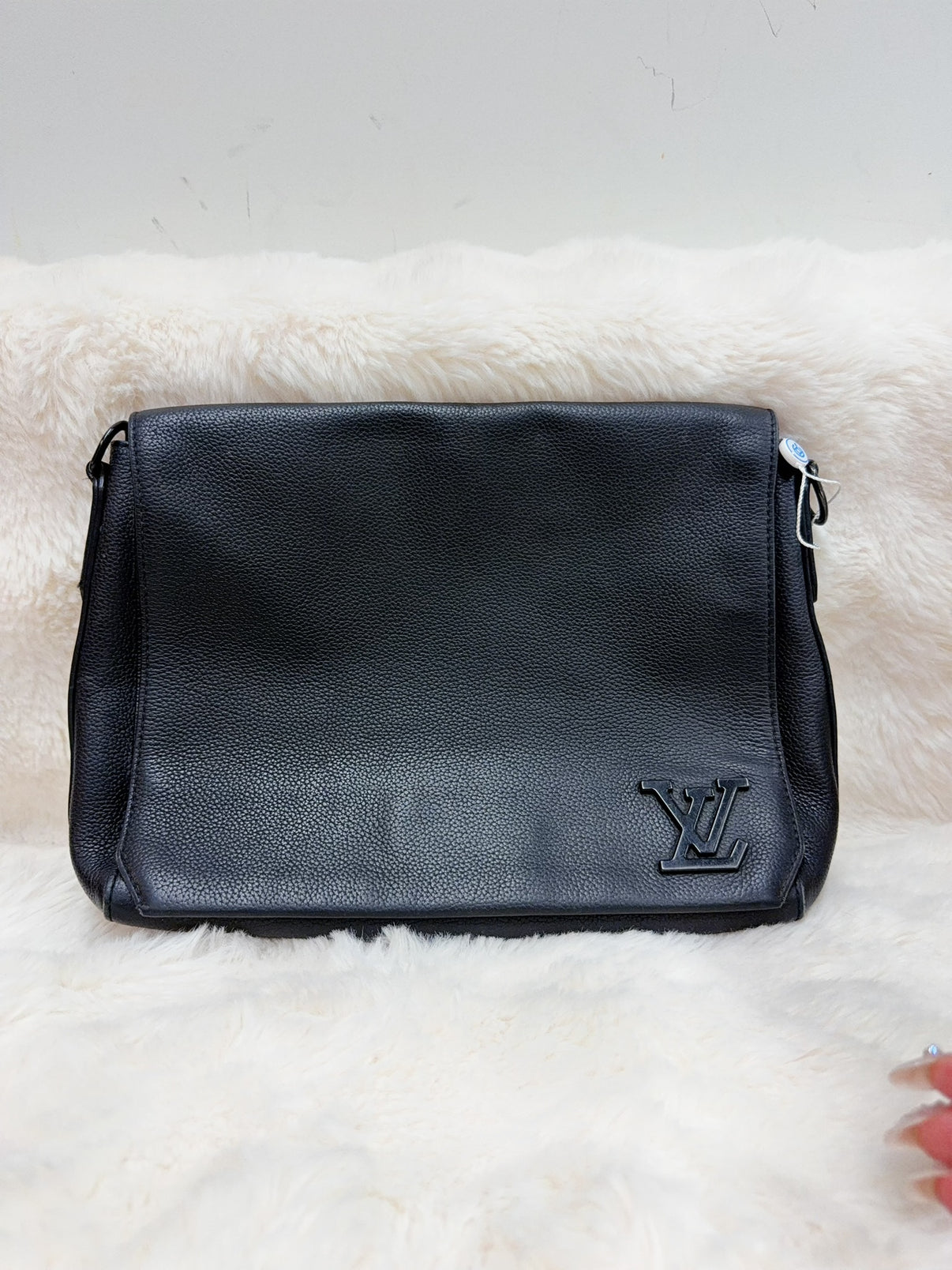 A sleek shoulder bag crafted in black grained leather, finished with an embossed LV logo at the corner. Clean lines and a minimalist design make it a versatile piece for everyday use.