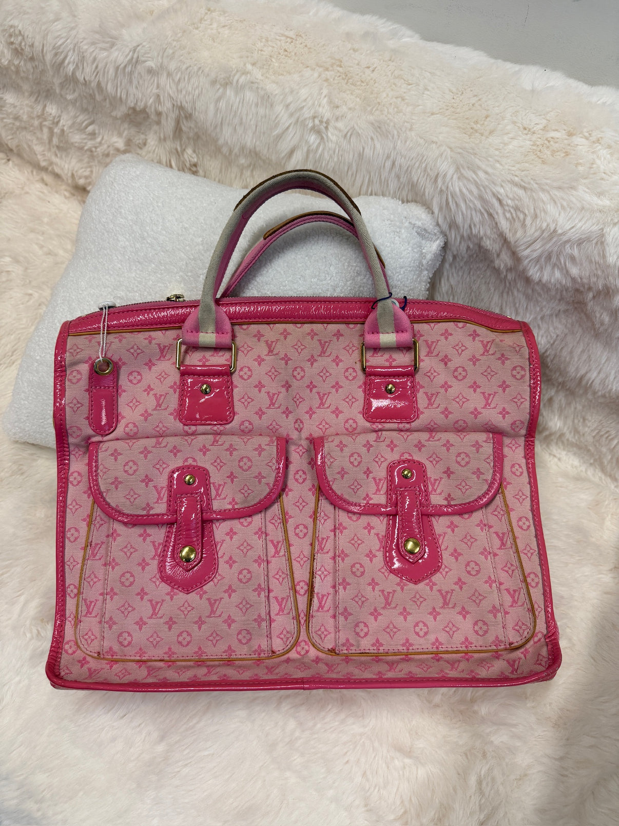 This Louis Vuitton handbag features the brand’s iconic monogram pattern on fabric, complemented by glossy pink leather trim. Designed with a structured silhouette and practical front pockets, it is a distinctive everyday piece with a bold colour finish.