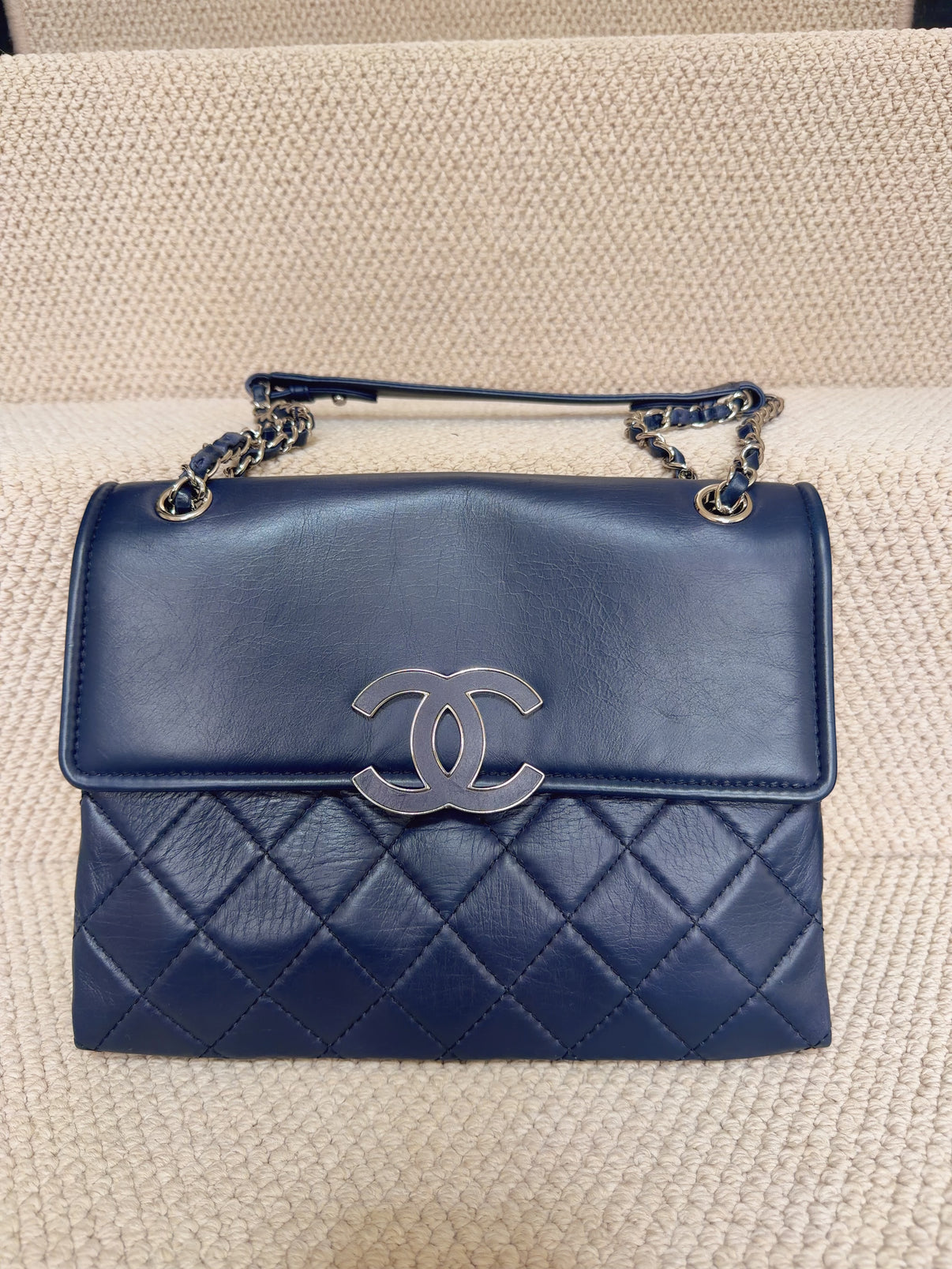 A classic Chanel Jumbo Flap crafted in soft quilted lambskin leather, featuring the iconic CC turn-lock and silver-tone hardware. The rich blue tone paired with aged silver hardware gives the piece a modern yet timeless look.