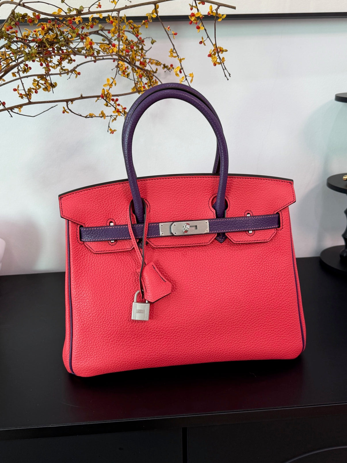 Hermès Birkin 30 in Jaipur Pink leather with Purple leather handles and strap, finished with brushed palladium hardware.