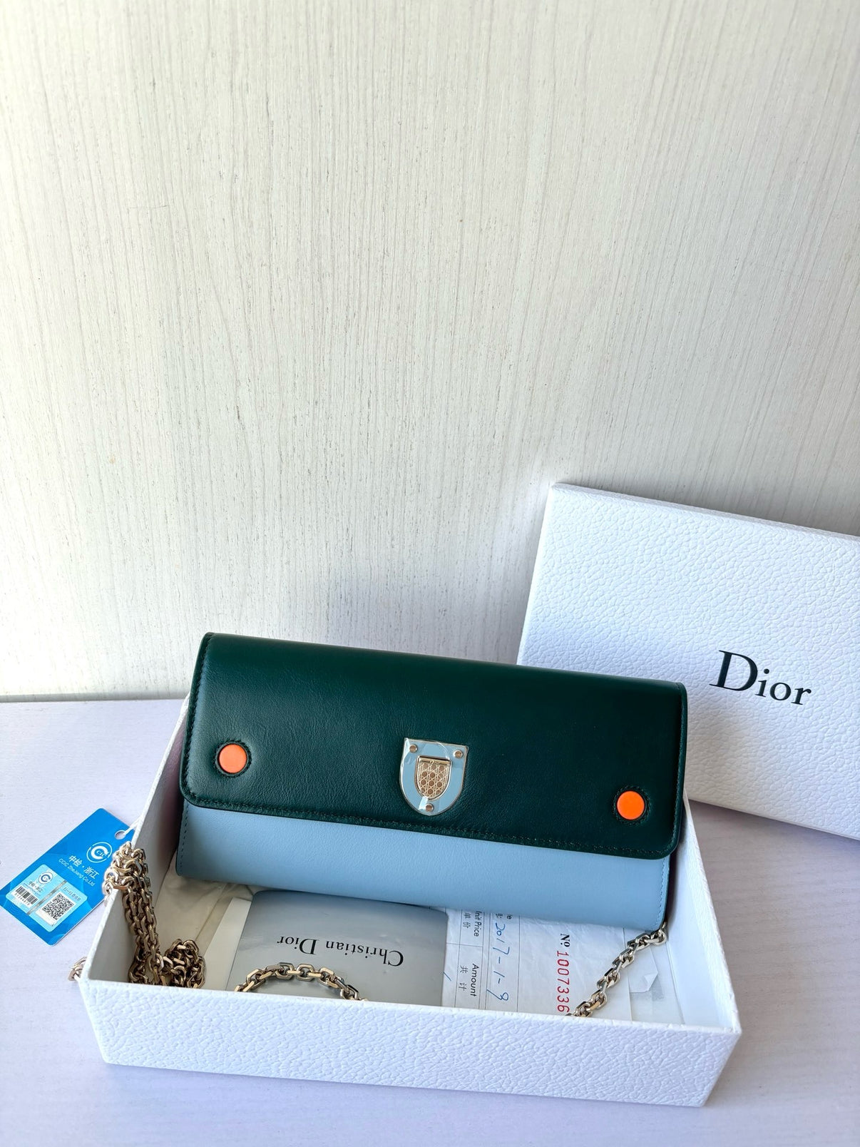 Structured leather chain wallet bag with signature metal clasp and clean flap design.