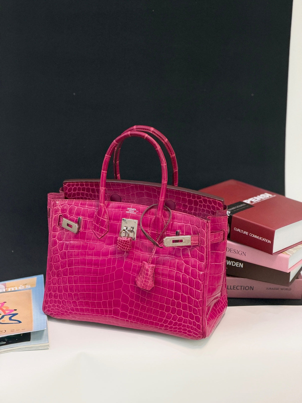 This Birkin 30 is crafted from alligator leather in a vibrant fuchsia colour with palladium hardware. The bag remains well-structured with a beautiful overall appearance.